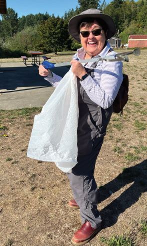 Phyllis Herring volunteers in a different project picking up litter.